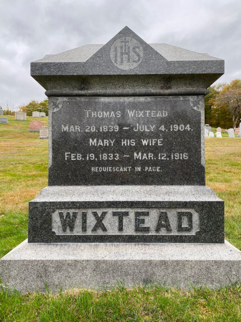 Grave site of your great-grandfather, Thomas Wixtead and his second wife, Mary (Dermody) Wixtead. At St. Denis Cemetery, Douglas, Massachusetts. Aunt Emma’s inscription is on the other side of the stone.