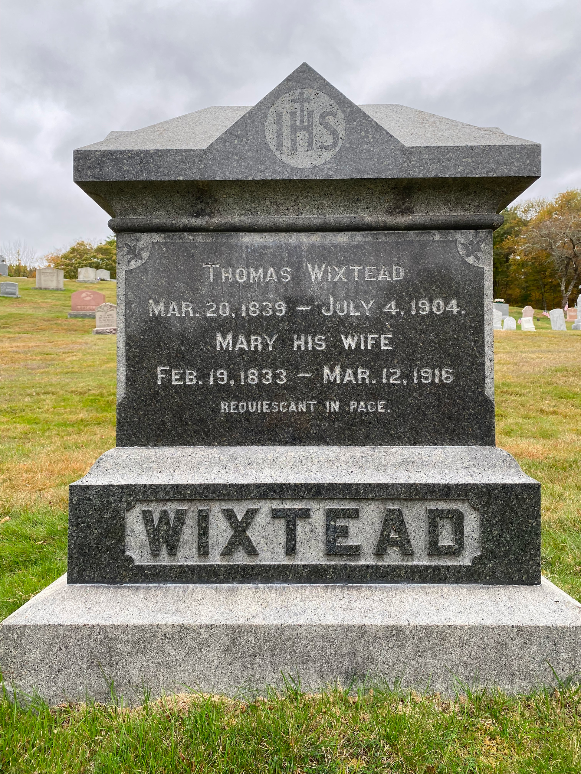 Grave site of your great-grandfather, Thomas Wixtead and his second wife, Mary (Dermody) Wixtead. At St. Denis Cemetery, Douglas, Massachusetts. Aunt Emma’s inscription is on the other side of the stone.